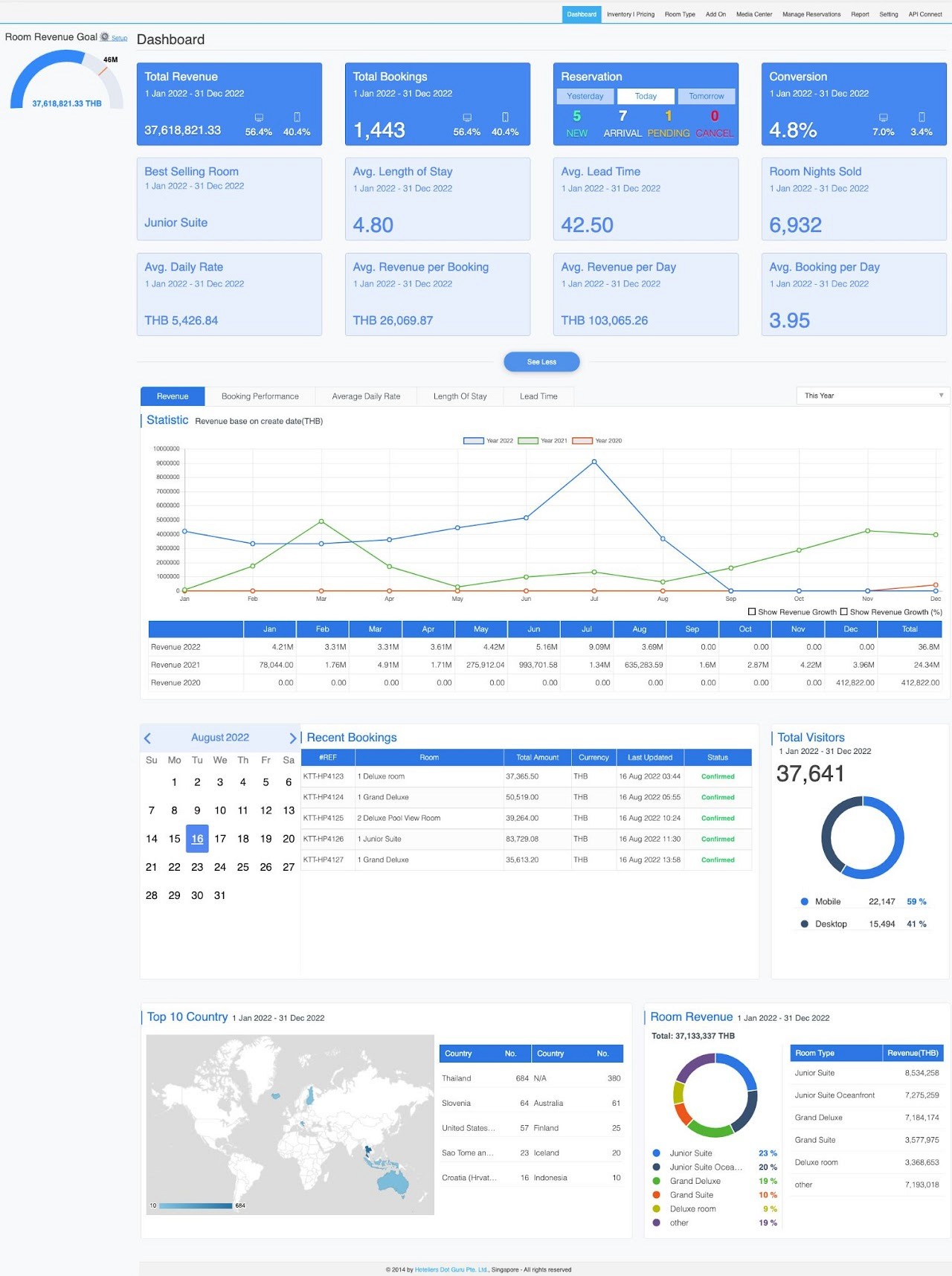 The Dashboard menu generates useful data for many important management reports that are needed in the hotel business such as revenue report, booking performance, average daily rate, length of stay and so on. These allow the hotel to be able to analyze booking sources and guests’ demography, which are very important for hotel’s marketing strategy.