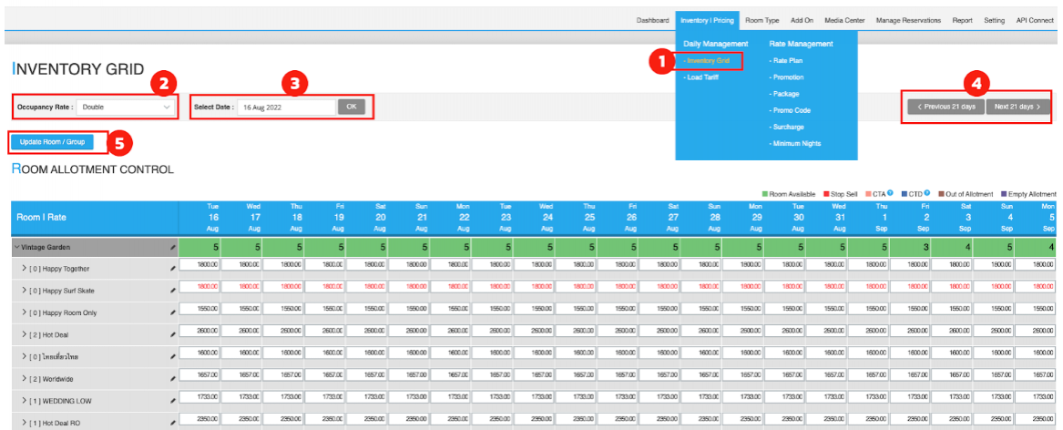 Inventory Grid : Inventory Grid is the page where you able to set the day-by-day rate & allotment.