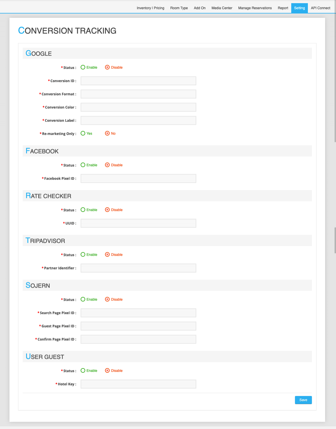 The hotel able to set up Conversion Tracking in Booking Engine for Google, Facebook, Rate Checker, Tripadvisor, Sojern and User Guest as the following steps :
