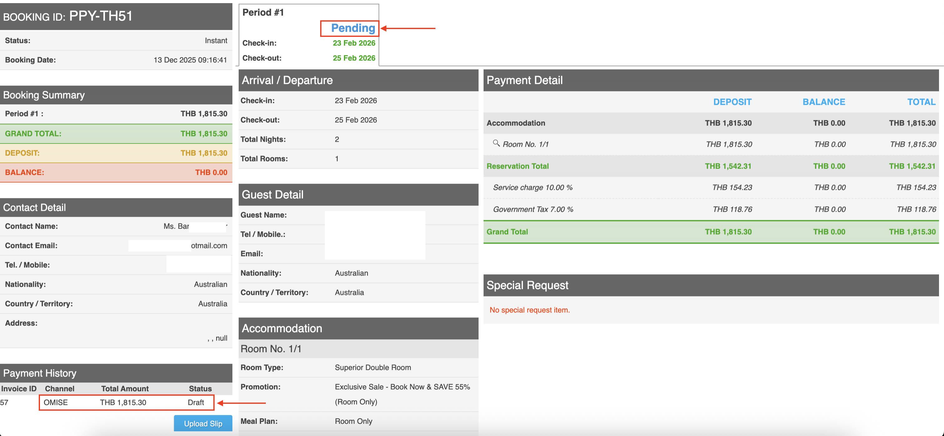 Please note : The hotel can directly upload the slip to the customer by pressing the “Upload Slip” button in the customer's booking number in the back-end system.