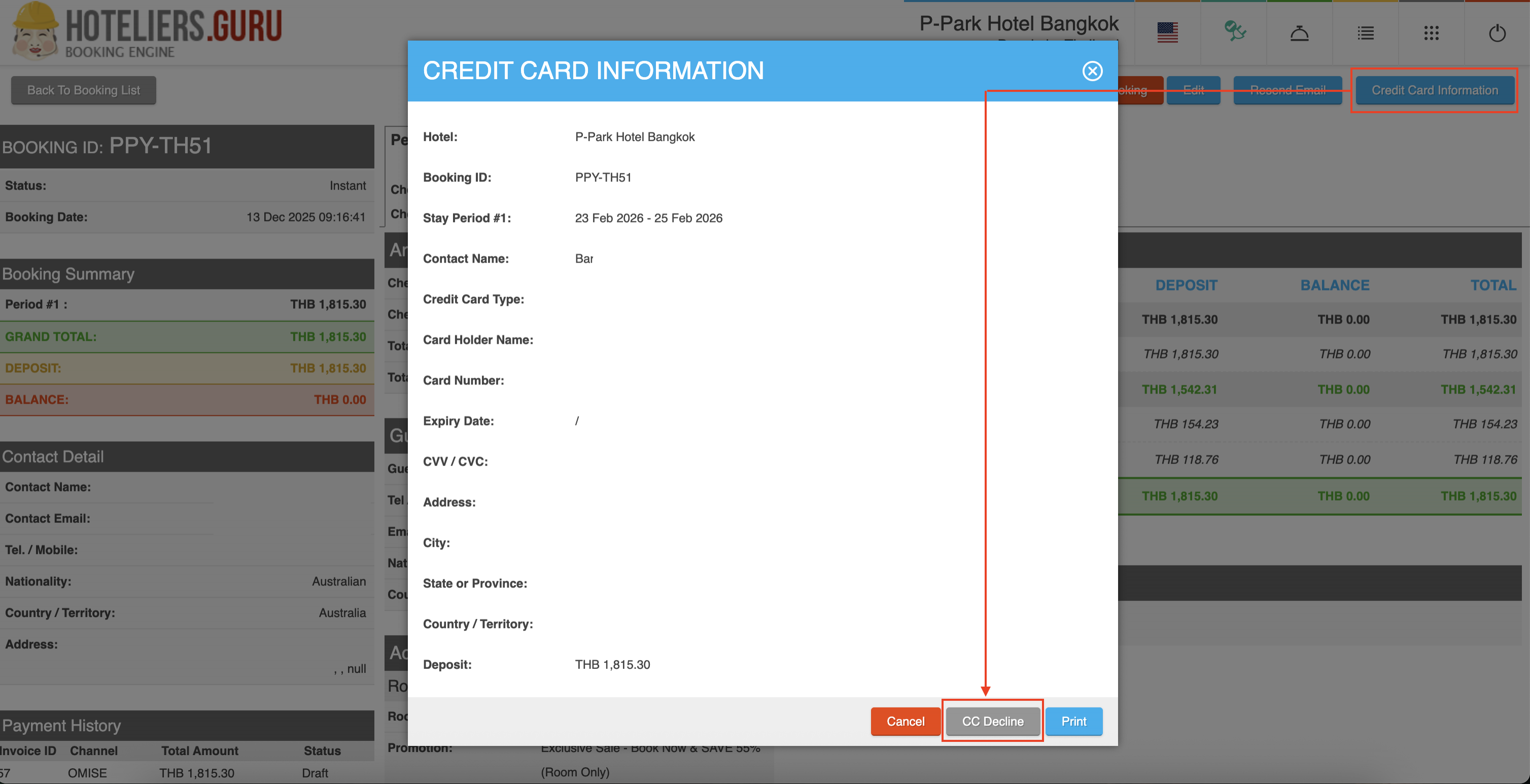 The Booking Engine will send an Awaiting Payment for Reservation email to notify the hotel to log in and manually click CC Declined, which will then notify the guest to re-enter payment details. The reservation status will be updated to CC Declined.