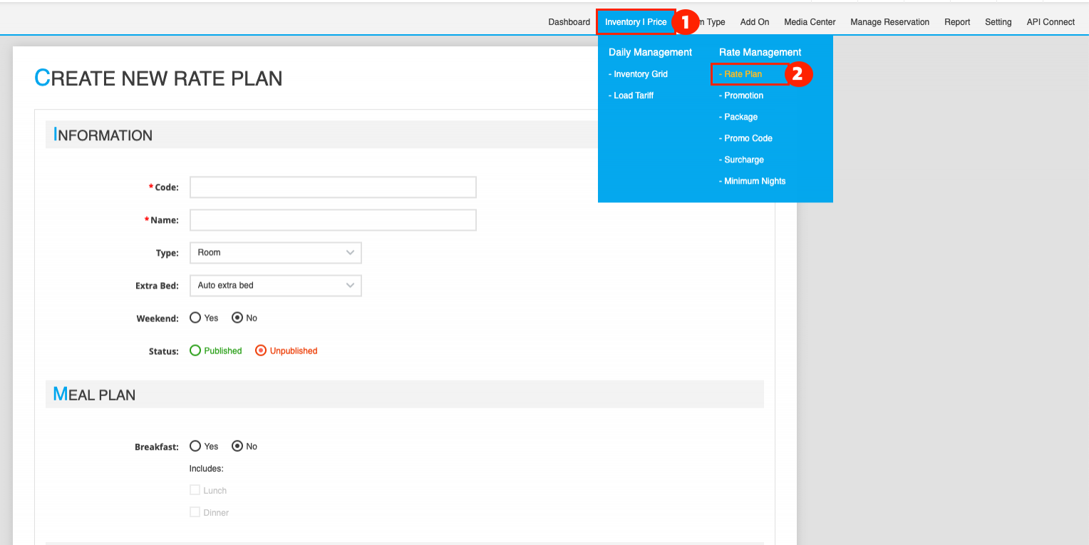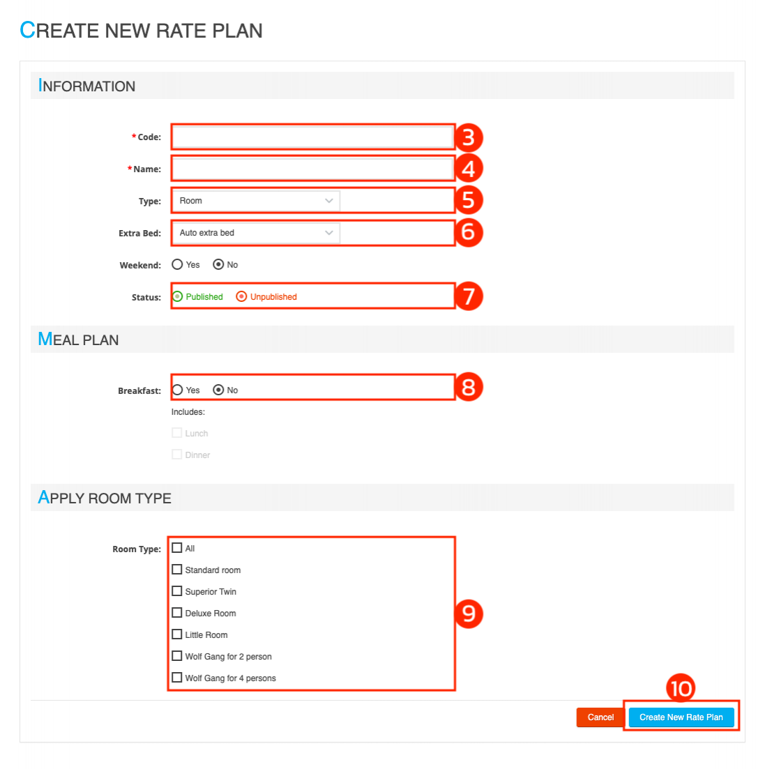 - Name -> entering rate plan name e.g., Room Only, Room with Breakfast