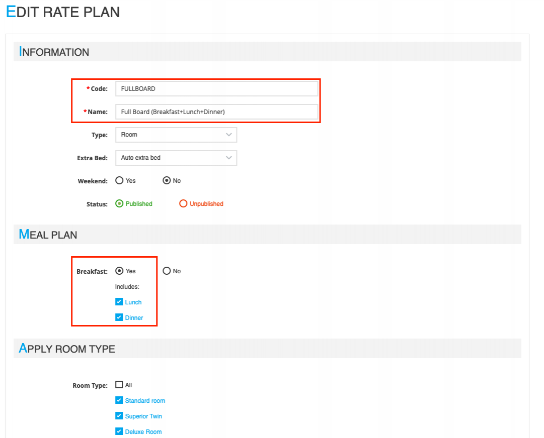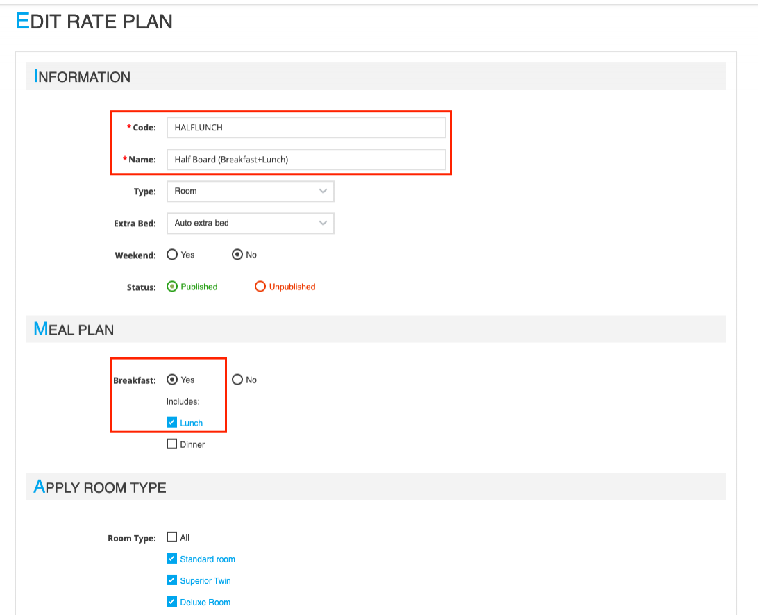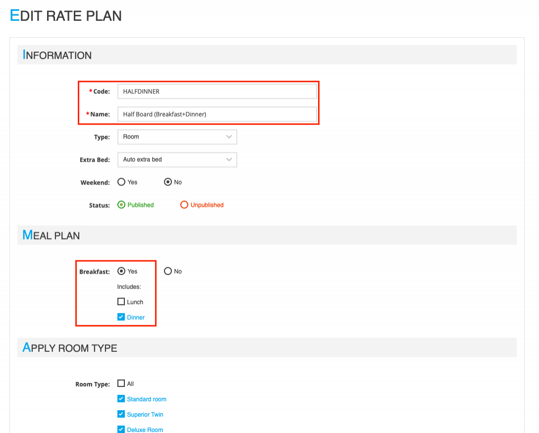 - Apply Room Type -> Room Type -> select a room type to apply on rate plan