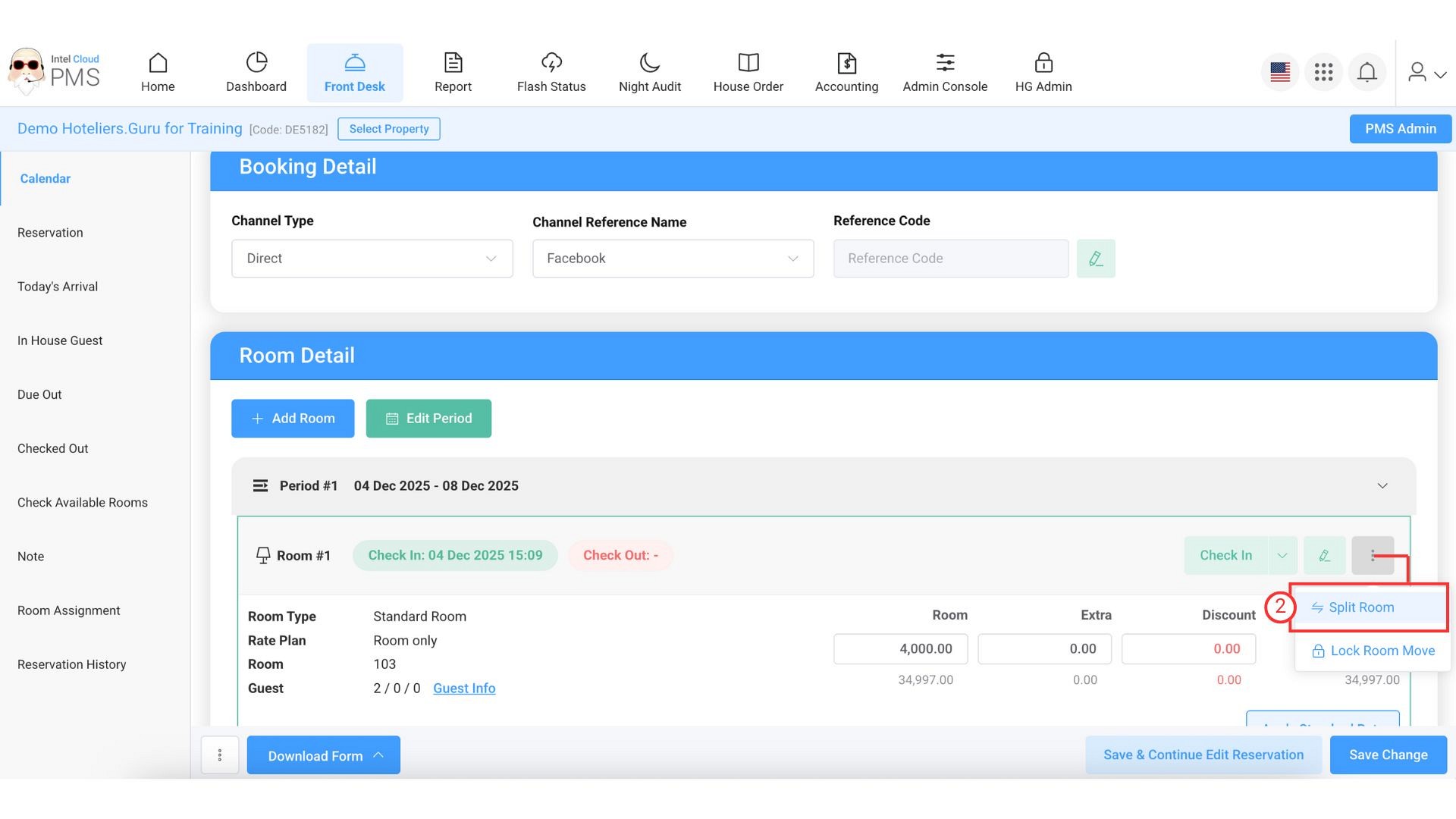 - In the reservation details, click the three-dots icon and select Split Room.