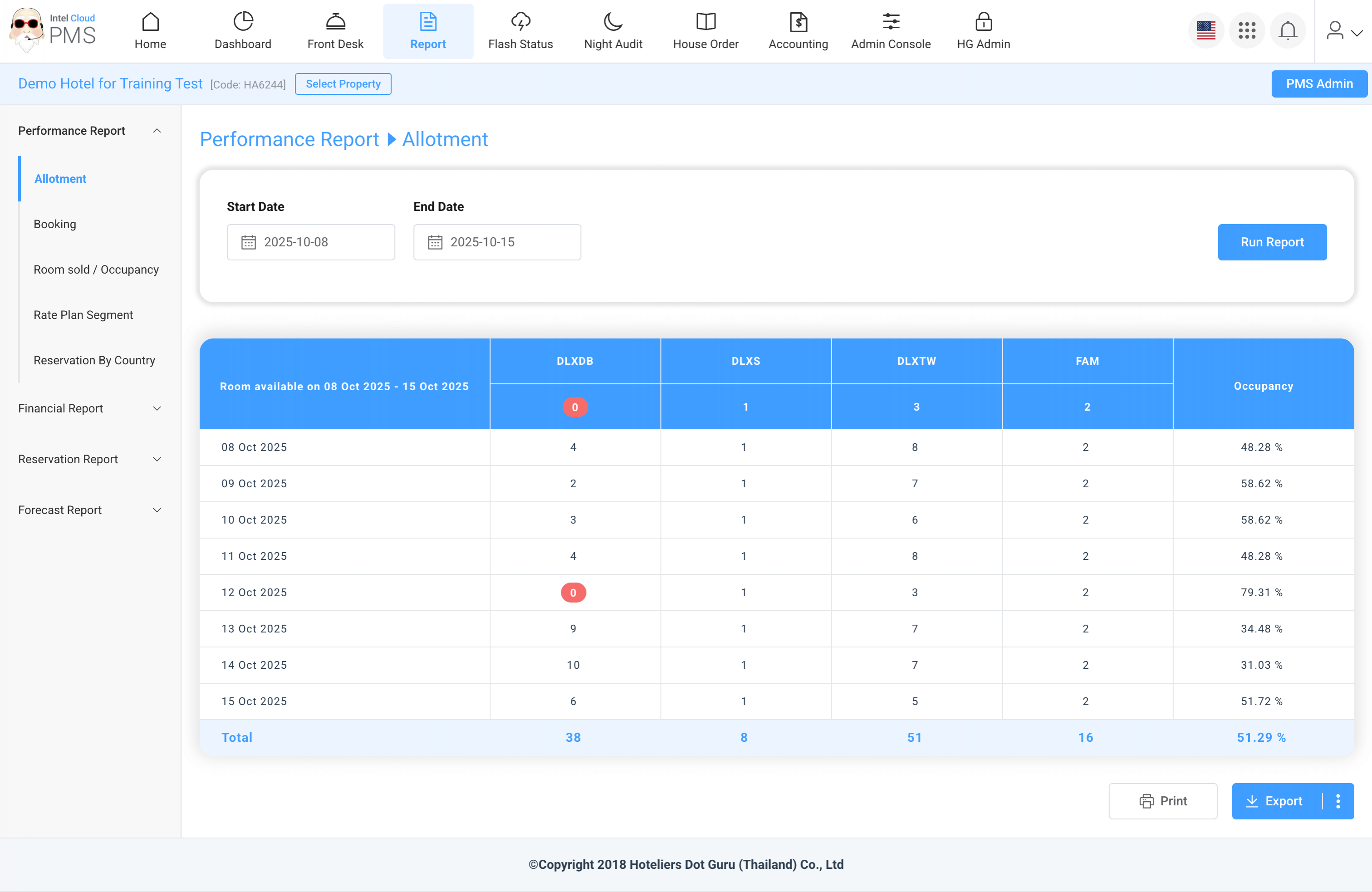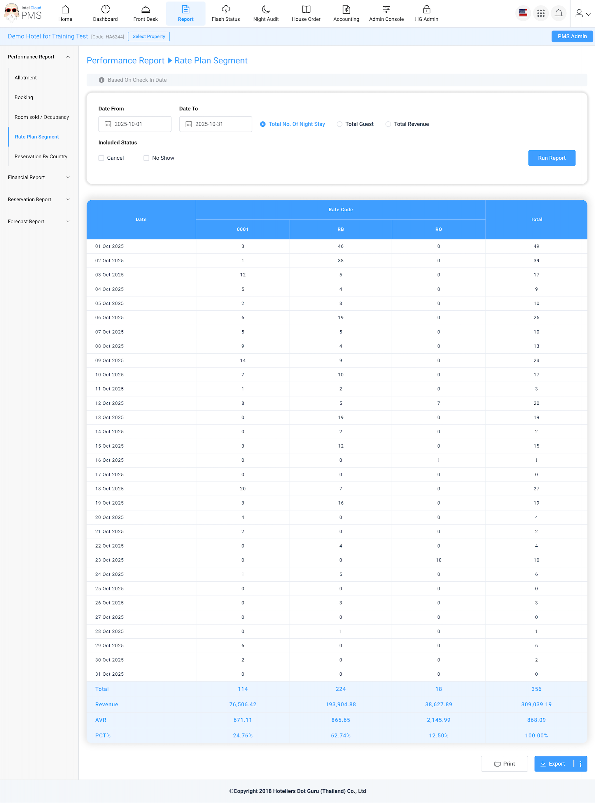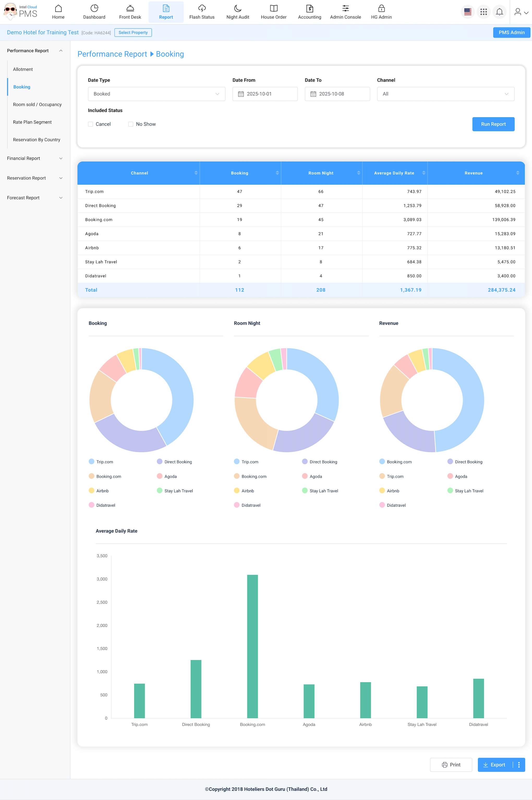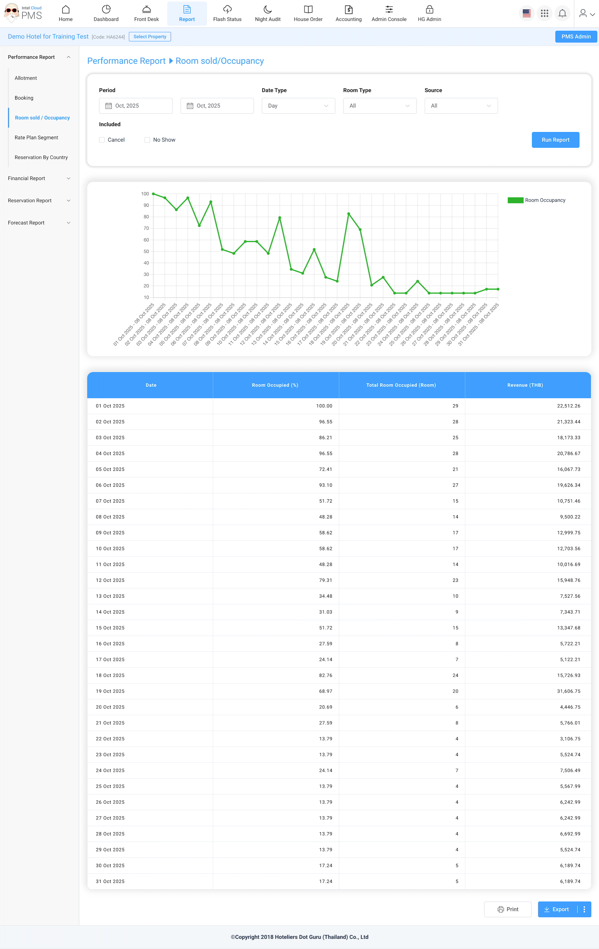 Shows the number of rooms sold and occupancy rates for daily, weekly, or monthly periods. This report helps evaluate hotel performance over time and identify high or low-demand periods.