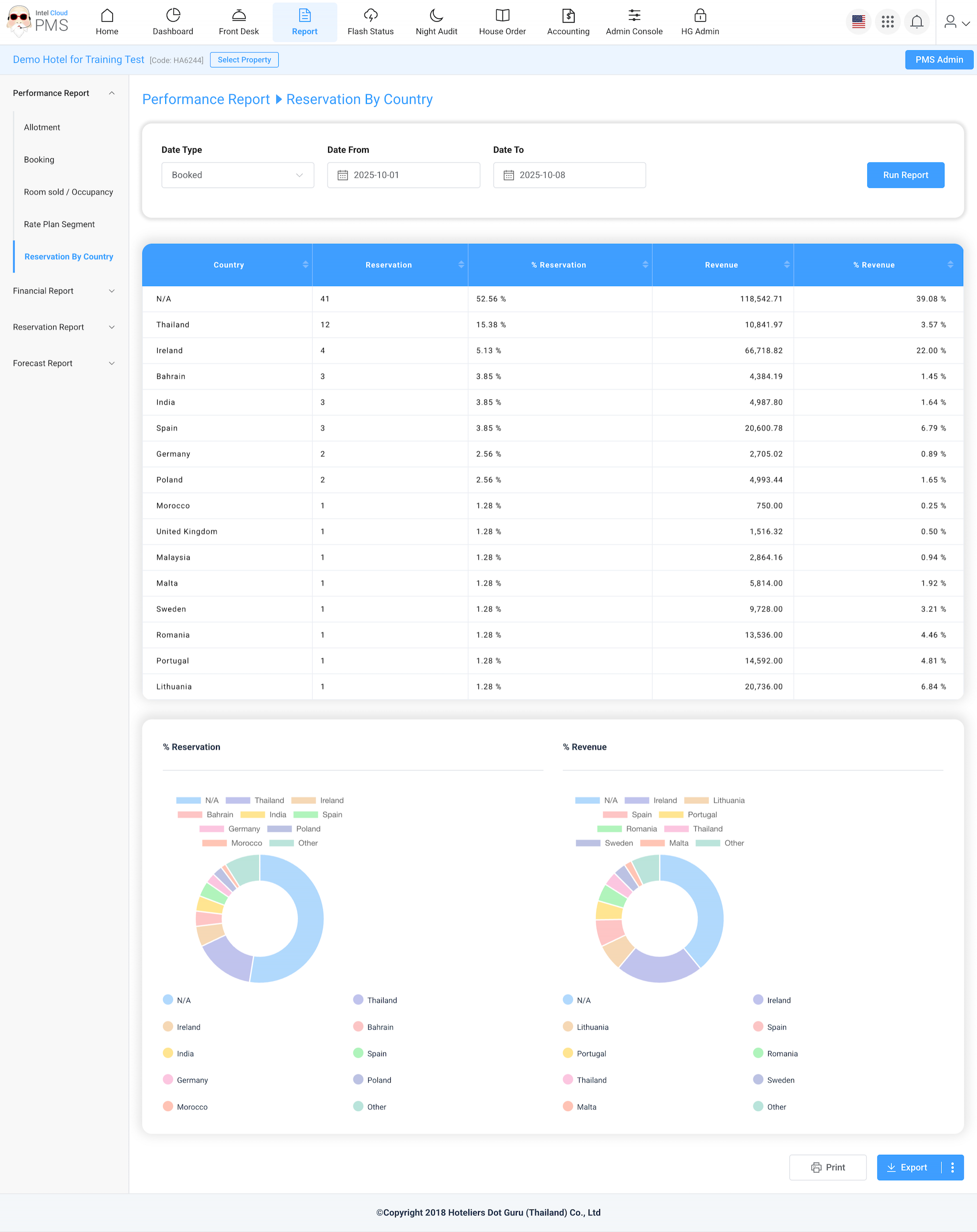Shows all reservations grouped by contacts’ country of origin. This helps the hotel understand which markets or countries generate the most bookings, useful for marketing and pricing strategies.