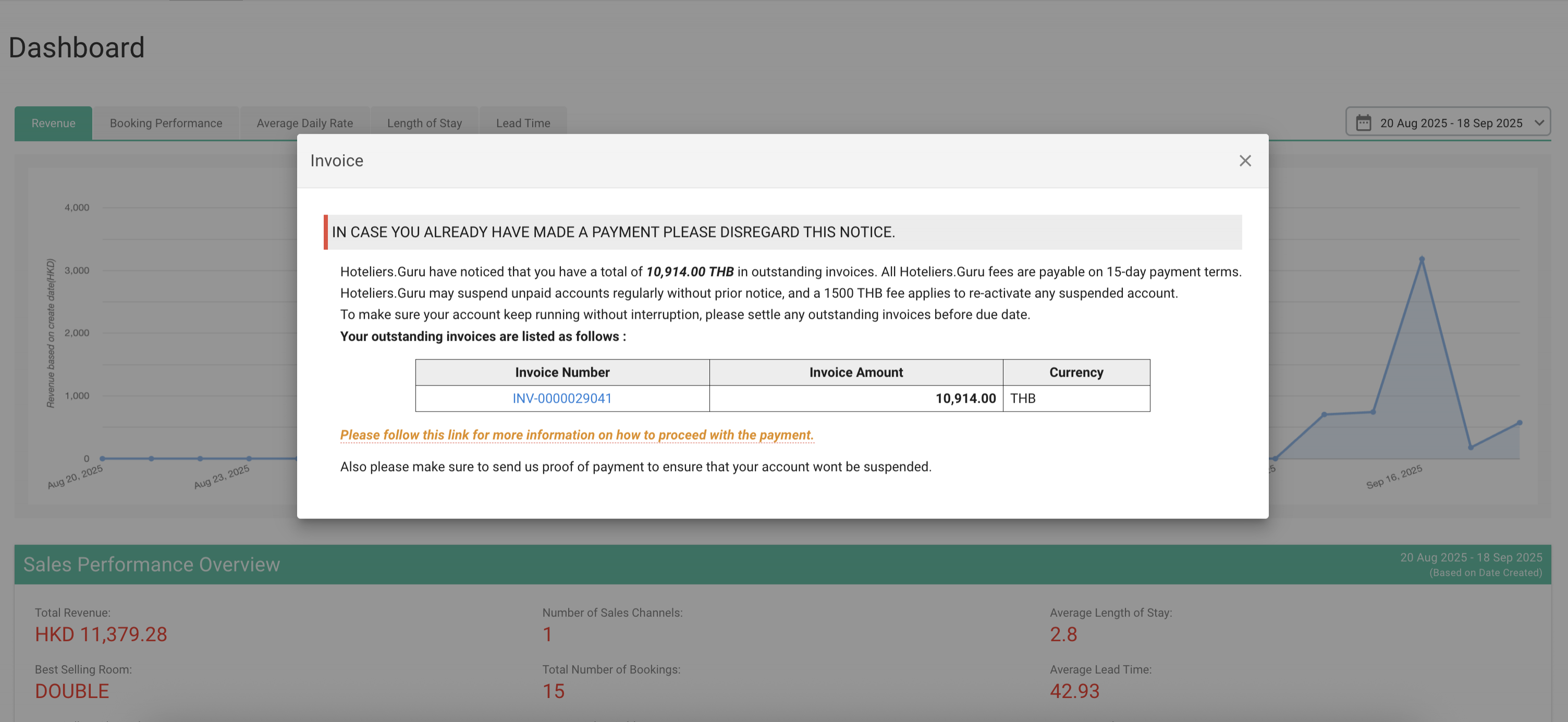 When payment is due, a popup notification will appear upon login, showing the outstanding service charge details.