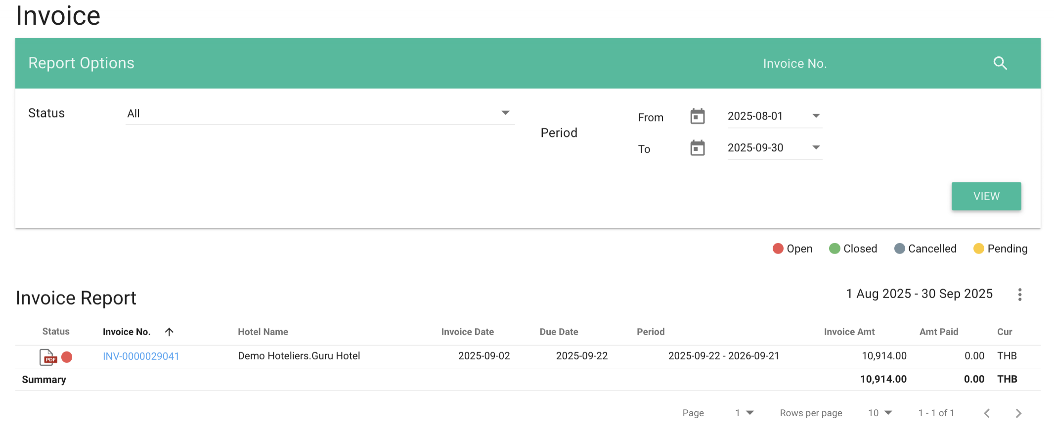 - Click View Report to display the invoice list below.
